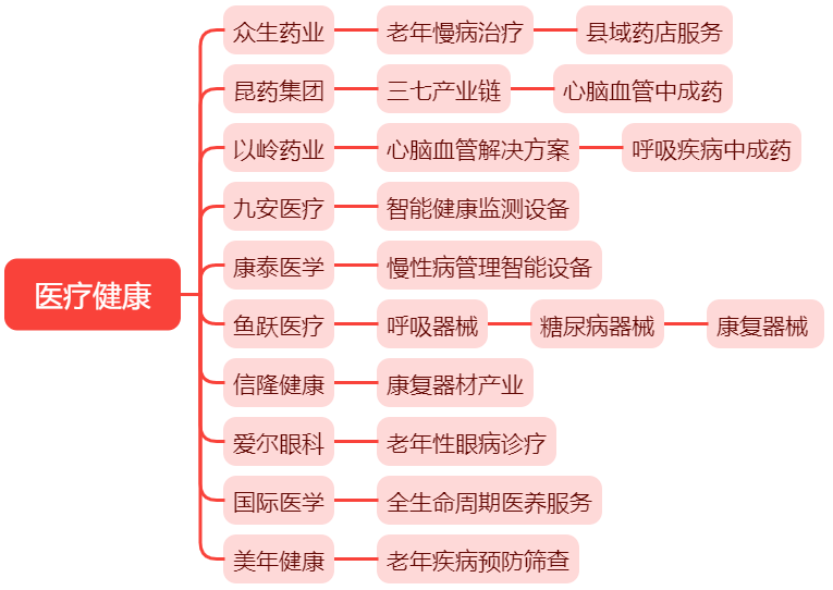 核心公司:众生药业(002317.SZ)、昆药集团(600422.SZ)、以岭药业(002603.SZ)、九安医疗(002432.SZ)、康泰医学(300869.SZ)、鱼跃医疗(002223.SZ)、信隆健康(002105.SZ)、爱尔眼科(300015.SZ)、国际医学(000516.SZ)、美年健康(002044.SZ)等。