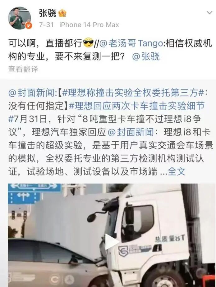 针对“8吨重型卡车撞不过理想i8争议”,理想汽车回应称,理想i8和卡车撞击的超级实验,是基于用户真实交通会车场景的模拟,全权委托专业的第三方检测机构测试认证,试验场地、测试设备以及市场端随机购买的测试卡车均由检测机构提供,理想汽车没有任何指定。理想汽车产品负责人汤靖甚至在社交平台称,“相信权威机构的专业,要不来复测一把?”另一位产线负责人张骁也表示,“可以啊,直播都行。”态度不可谓不刚。