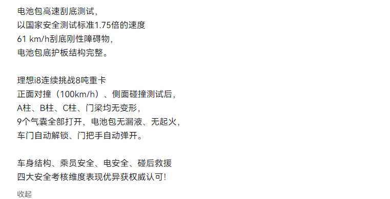 理想汽车发布的哔哩哔哩视频显示,理想i8连续挑战8吨重卡正面对撞(100km/h)、侧面碰撞测试后,A柱、B柱、C柱、门梁均无变形,9个气囊全部打开,电池包无漏液、无起火,车门自动解锁、门把手自动弹开。并强调“车身结构、乘员安全、电安全、碰后救援,四大安全考核维度表现优异获权威认可!”