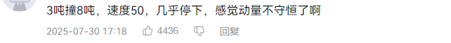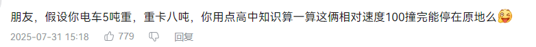 视频一经发布,便在网络上引发热议。有网友表示“做对撞实验一定要懂物理”“3吨撞8吨,速度50,几乎停下,感觉动量不守恒了啊”“朋友,假设你电车5吨重,重卡八吨,你用点高中知识算一算这俩相对速度100撞完能停在原地么”,更有甚者调侃道“相当于我把奥尼尔撞飞了”也有网友为乘龙重卡无辜躺枪、而鸣不平......