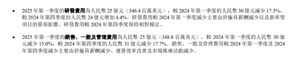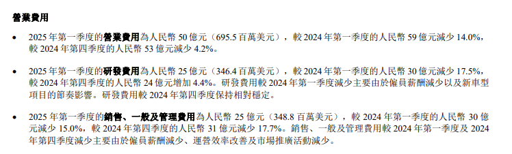 打深一度,当期公司营业费用同比下降14%,降至50亿元。其中,研发费同比减少17.5%至25亿元;“销售、一般及管理费用”同比减少15%至25亿元,二者累计减少10亿元。