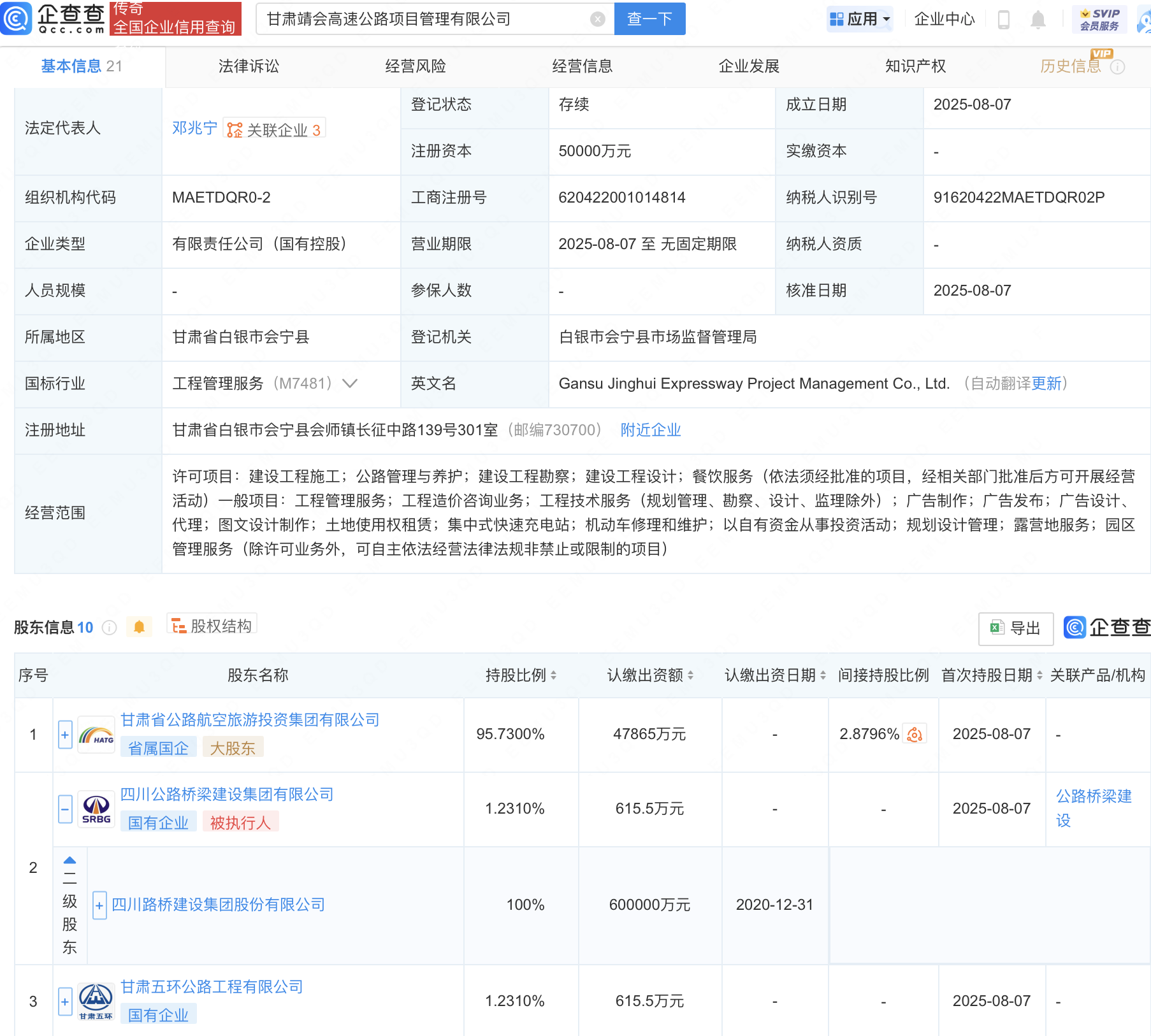 四川路桥等成立甘肃靖会高速公路项目管理公司,注册资本5亿
