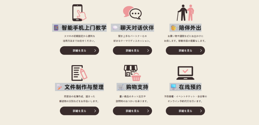 AgeWellJapan针对用户日常的实际需求,设计了多种服务组合,单次服务时长通常在2小时以内,且涵盖如对话散步、兴趣陪伴等更加日常的生活场景。