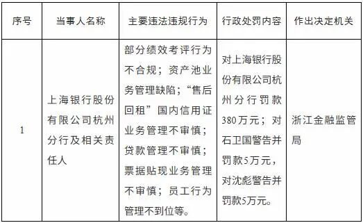 8月4日,因部分绩效考评行为不合规、贷款管理不审慎等6项违法违规行为,上海银行杭州分行被罚380万元。