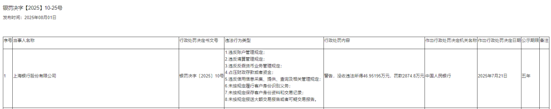 而不足半月前,7月21日,因涉及违反账户管理规定、清算管理规定等8项违法违规行为,上海银行刚被罚没2921.75万元。同时,15名相关责任人被罚108.5万元。违法行为横跨多个业务条线和部门层级,暴露出基础业务规范存在漏洞。