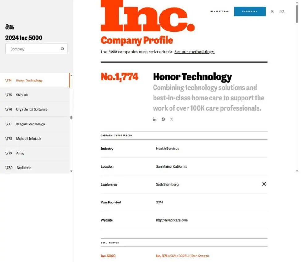2024年,Honor位据Inc.5000 全行业第1774名,覆盖全球14个国家、10万名护理员、数百万老人,三年间营收增长3倍。