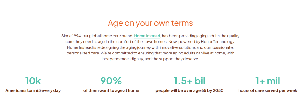 2020年,Honor获得D轮1.4亿美元融资,后“高级护理人员”(Care Pros)增加了一百多名。2021年8月,Honor以21亿美元收购全球家庭护理供应商Home Instead。