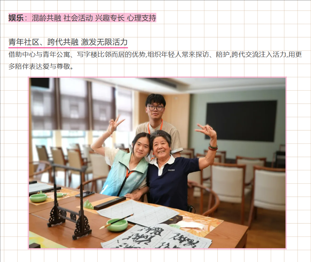 养老机构是“青银共居”的理想空间之一。在浙江、吉林、广东等地,机构将闲置房间出租给年轻人,既能提高资源利用率,也能在一定程度上改善盈利情况。同时以减免租金为条件,交换年轻人付出时间来陪伴老人,能够实现代际之间的良性沟通,为老人们打造理想的代际交流环境。