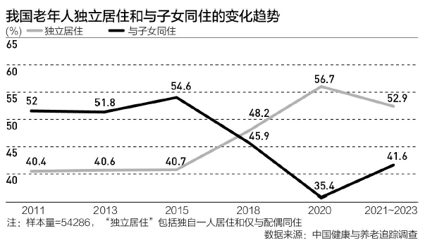 根据武汉大学研究团队的测算,截至2023年底,我国60+独居老人约1.6亿人,占老年人口的54%;其中80岁以上高龄老年人独居比例上升最快,占独居老人的一半。