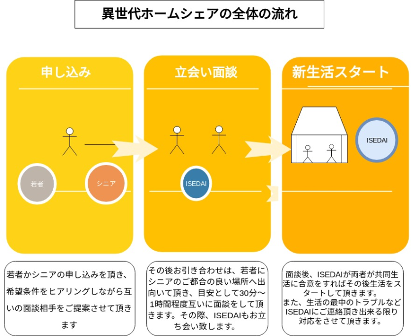 日本ISEDAI平台作为中介,招募愿意以低价出租房间换取陪伴的老年人,并联系想要节省租房成本、愿意陪伴老人的年轻人,在东京、横滨、埼玉、千叶等大城市均开展服务。