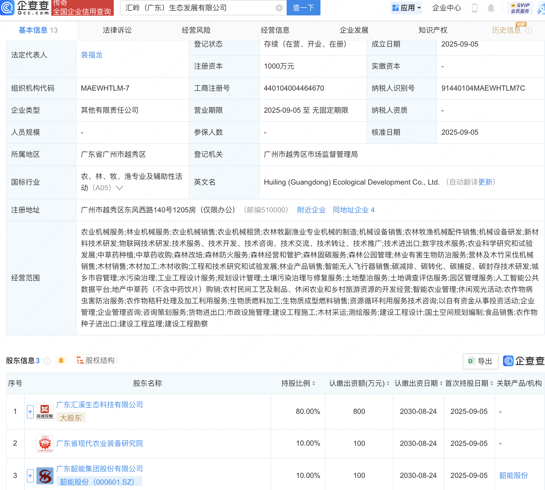 企查查APP显示,近日,汇岭(广东)生态发展有限公司成立,注册资本1000万元,经营范围包含:智能无人飞行器销售;人工智能公共数据平台;生物质成型燃料销售等。企查查股权穿透显示,该公司由韶能股份(000601)等共同持股。