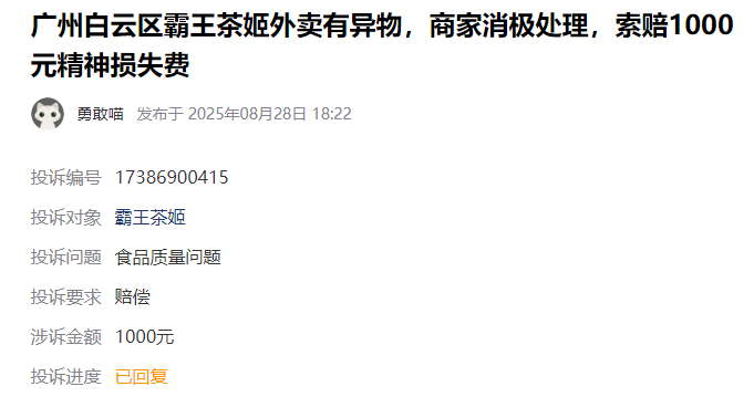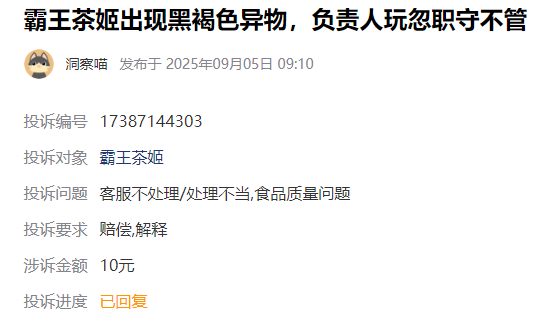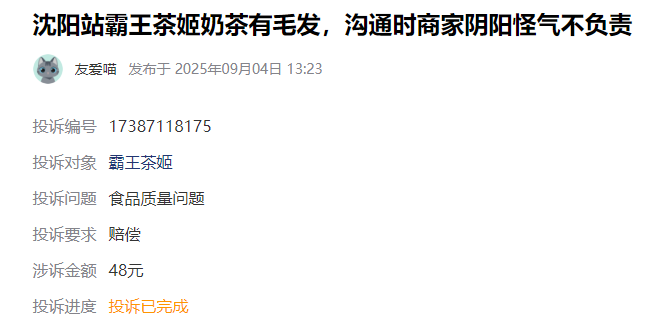 如9月4日,投诉编号17387118175显示,一用户表示在霸王茶姬线下门店喝到一根带卷曲毛发的奶茶,沟通过程中,商家阴阳怪气且抱有怀疑态度,沟通态度恶劣拒不处理。