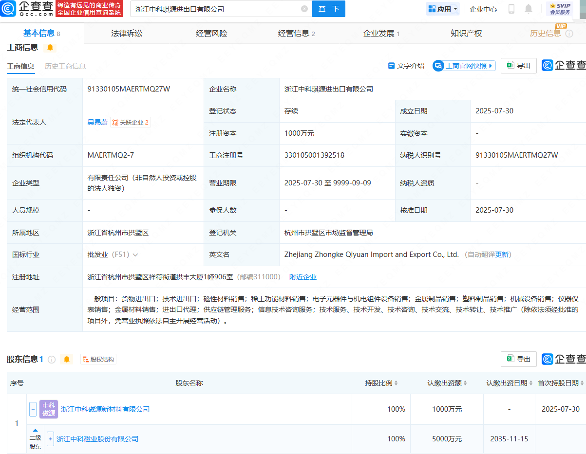 企查查APP显示,浙江中科琪源进出口有限公司成立,法定代表人为吴昂蔚,注册资本为1000万元,经营范围包含:磁性材料销售;稀土功能材料销售;电子元器件与机电组件设备销售;金属制品销售;塑料制品销售等。企查查股权穿透显示,该公司由中科磁业(301141)间接全资持股。