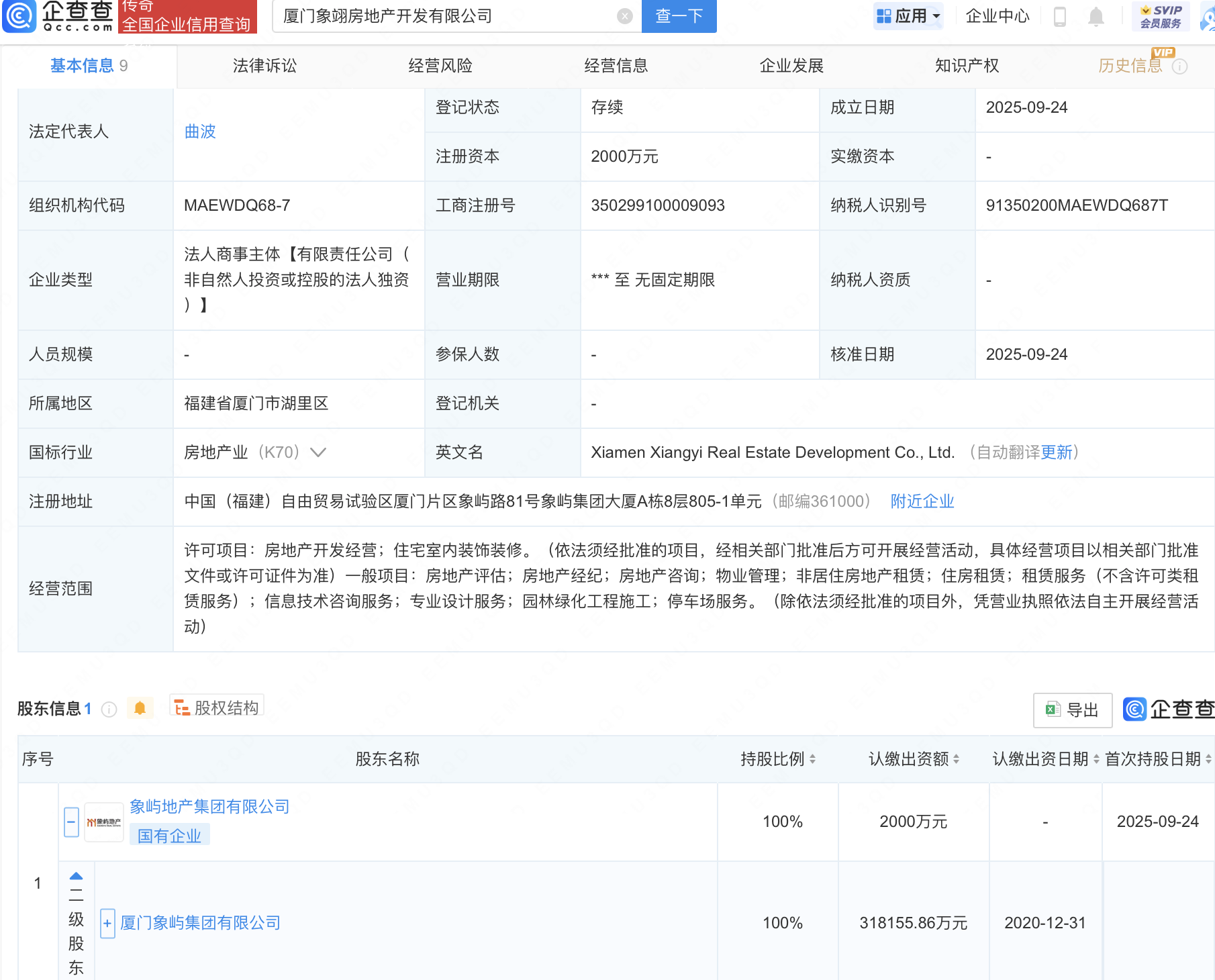 企查查APP显示,近日,厦门象翊房地产开发有限公司成立,注册资本2000万元,经营范围包含:房地产开发经营;住宅室内装饰装修;房地产评估;房地产经纪等。企查查股权穿透显示,该公司由厦门象屿集团有限公司间接全资持股。