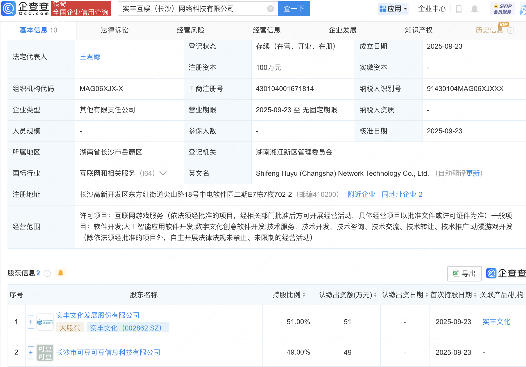 企查查APP显示,近日,实丰互娱(长沙)网络科技有限公司成立,法定代表人为王君娜,经营范围包含:互联网游戏服务;人工智能应用软件开发;数字文化创意软件开发;动漫游戏开发等。企查查股权穿透显示,该公司由实丰文化(002862)等共同持股。