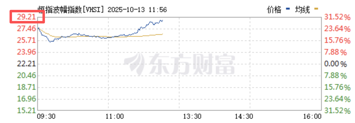 港股也同样低开。恒生指数开盘报25634.0点,跌2.50%;恒生科技指数开盘报6107.65点,跌2.43%。随后港股跌幅扩大,截至早盘收盘,恒指跌3.49%,恒生科技指数跌4.54%。值得关注的是,港股版“恐慌指数”—恒生波幅指数大涨近30%,突破2025年5月以来新高。