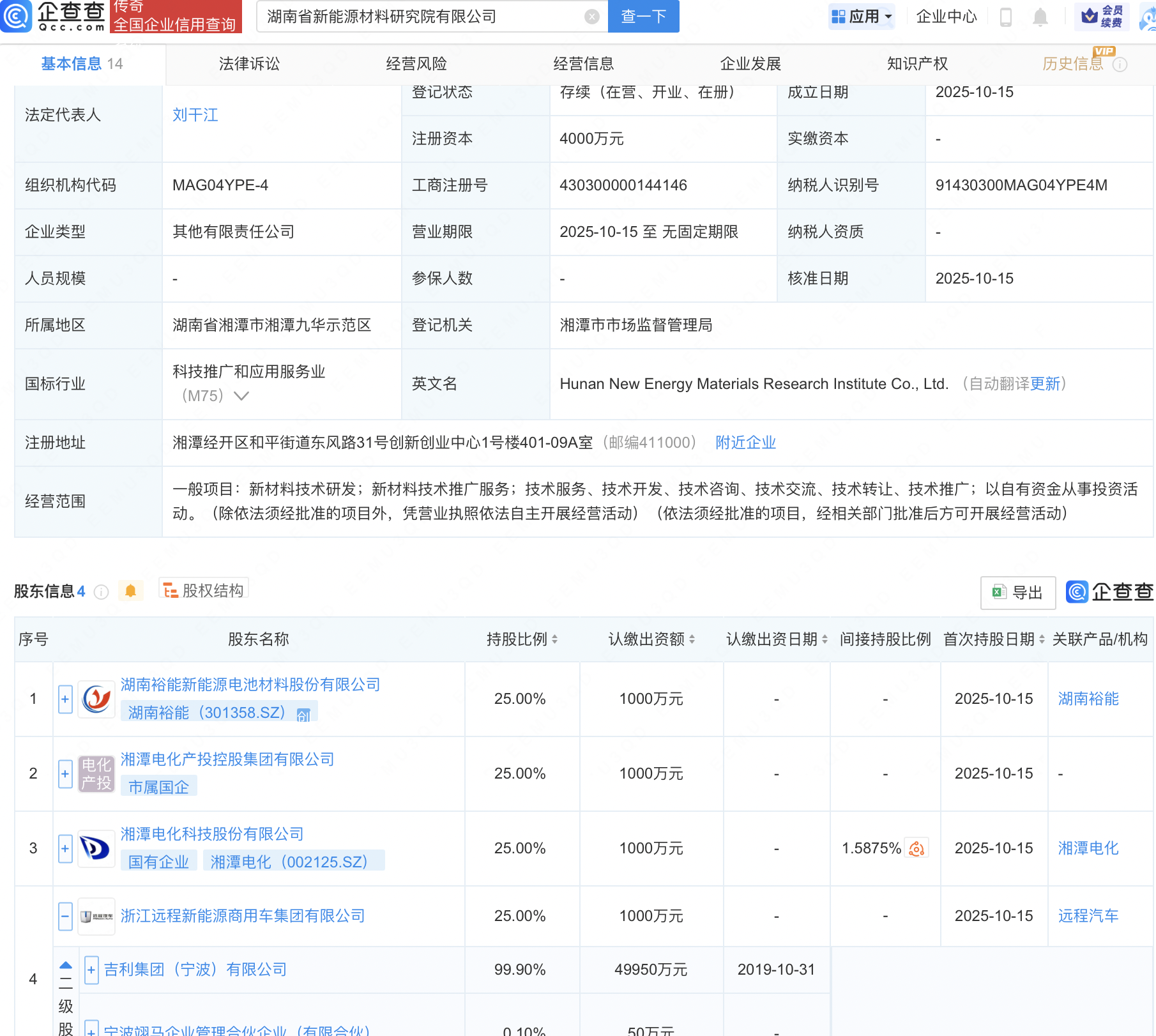 企查查APP显示,近日,湖南省新能源材料研究院有限公司成立,注册资本4000万元,经营范围包含:新材料技术研发;新材料技术推广服务;以自有资金从事投资活动等。企查查股权穿透显示,该公司由湖南裕能(301358)、湘潭电化(002125)、吉利集团(宁波)有限公司旗下浙江远程新能源商用车集团有限公司等共同持股。