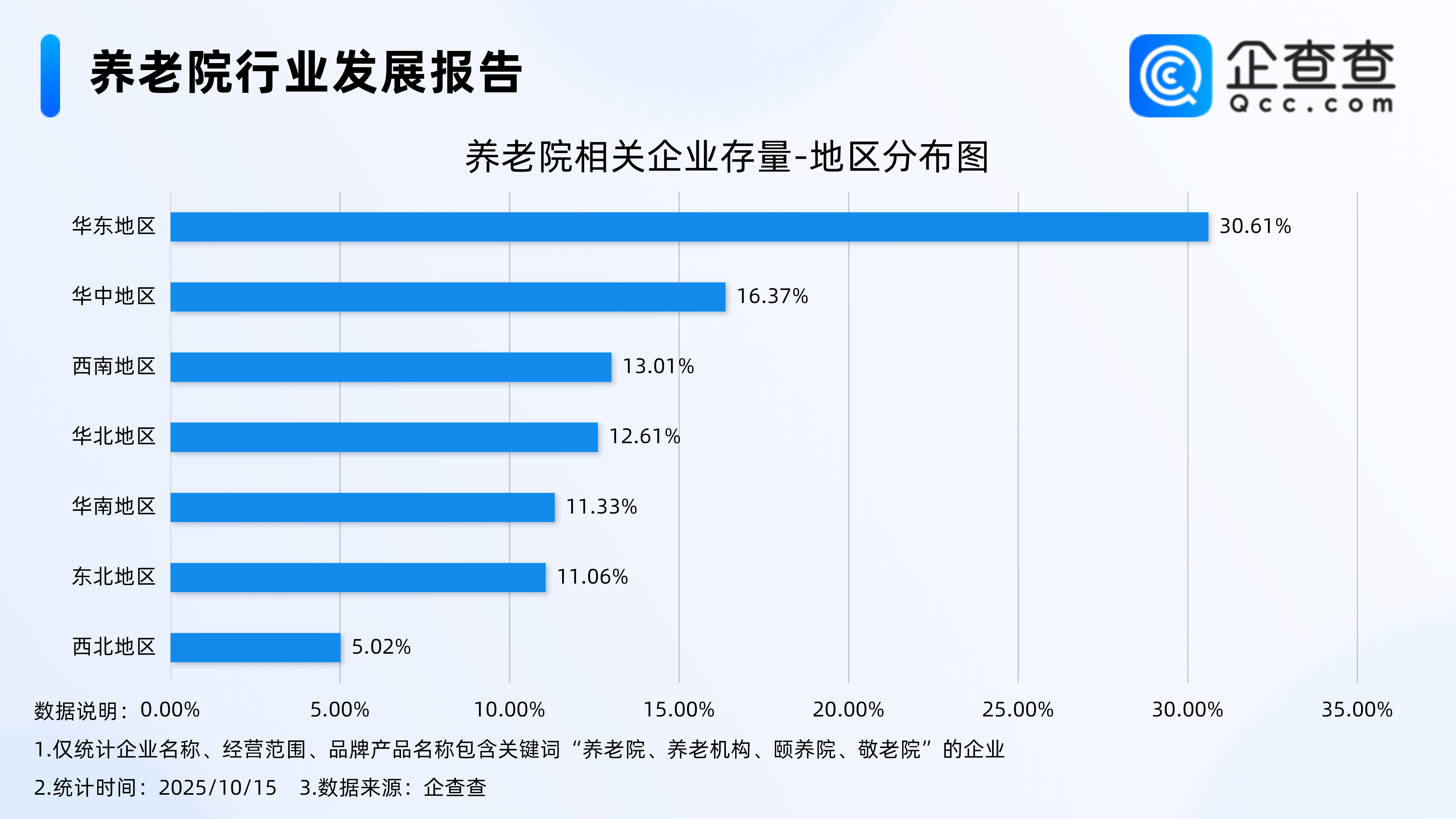 企查查数据显示,截至10月15日,国内现存养老院相关企业2.94万家。注册量方面,2024年全年注册养老院相关企业915家,截至目前,今年已注册744家,其中前9月注册730家,同比增长6.57%。存量方面,从经营时间来看,养老院相关企业多为老牌企业,超七成相关企业成立5年以上,其中成立年限在5-10年的相关企业最多,占比51.55%。从地区分布来看,养老院相关企业主要集中分布在华东地区,占比达30.61%。