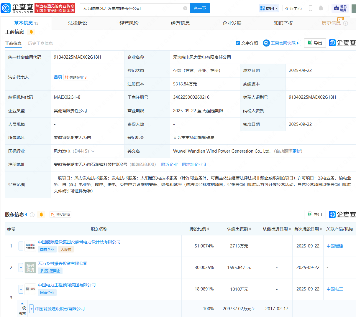 企查查APP显示,近日,无为皖电风力发电有限责任公司成立,法定代表人为吕勇,注册资本为5318.84万元,经营范围包含:风力发电技术服务;发电技术服务;太阳能发电技术服务;发电业务、输电业务、供(配)电业务等。企查查股权穿透显示,该公司由中国能源建设集团安徽省电力设计院有限公司、中国能建(601868)全资子公司中国电力工程顾问集团有限公司等共同持股。