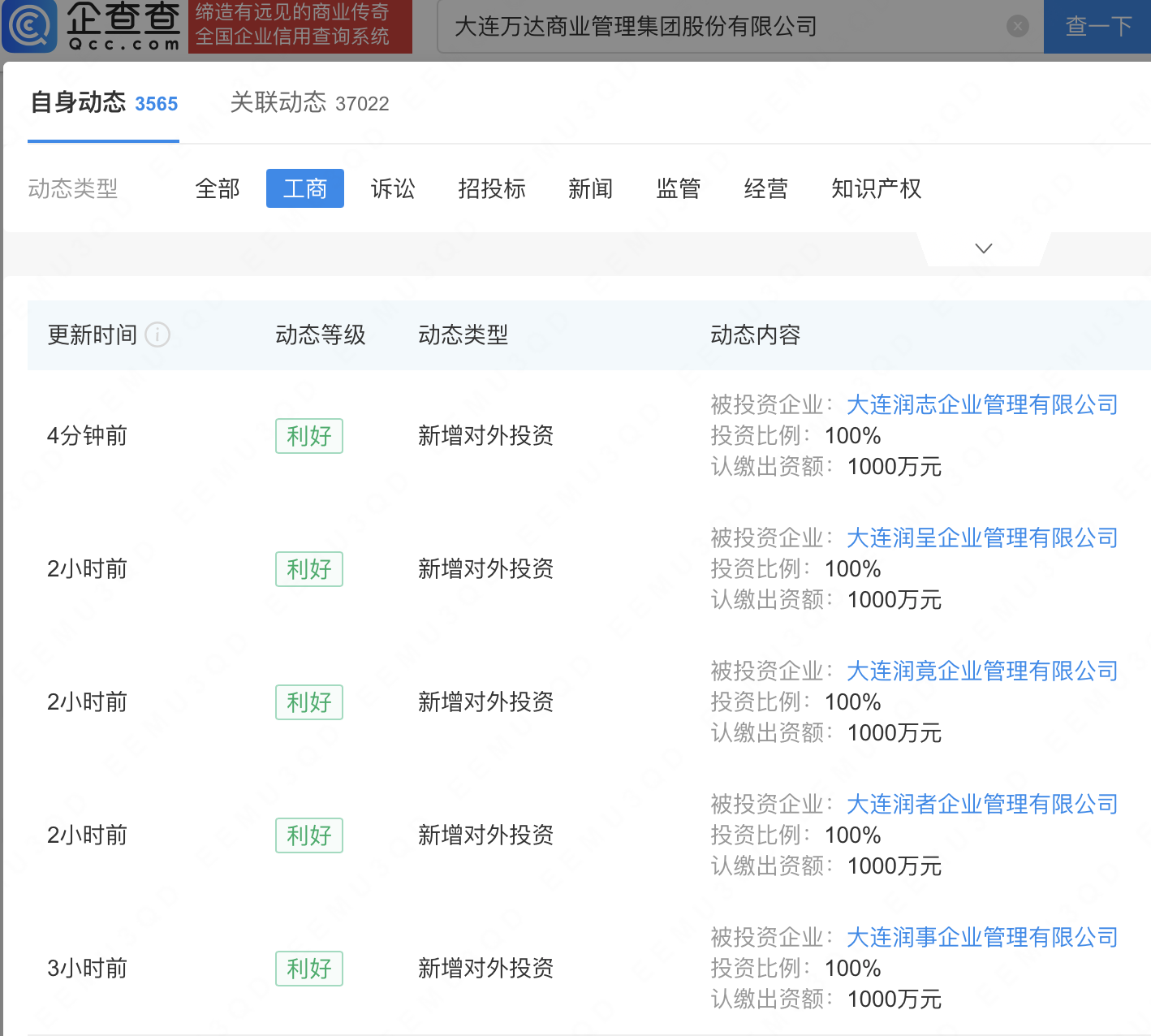 企查查APP显示,近日,大连润志企业管理有限公司、大连润呈企业管理有限公司、大连润竟企业管理有限公司、大连润者企业管理有限公司、大连润事企业管理有限公司成立,注册资本均为1000万元。企查查股权穿透显示,上述公司皆由大连万达商业管理集团股份有限公司全资持股。