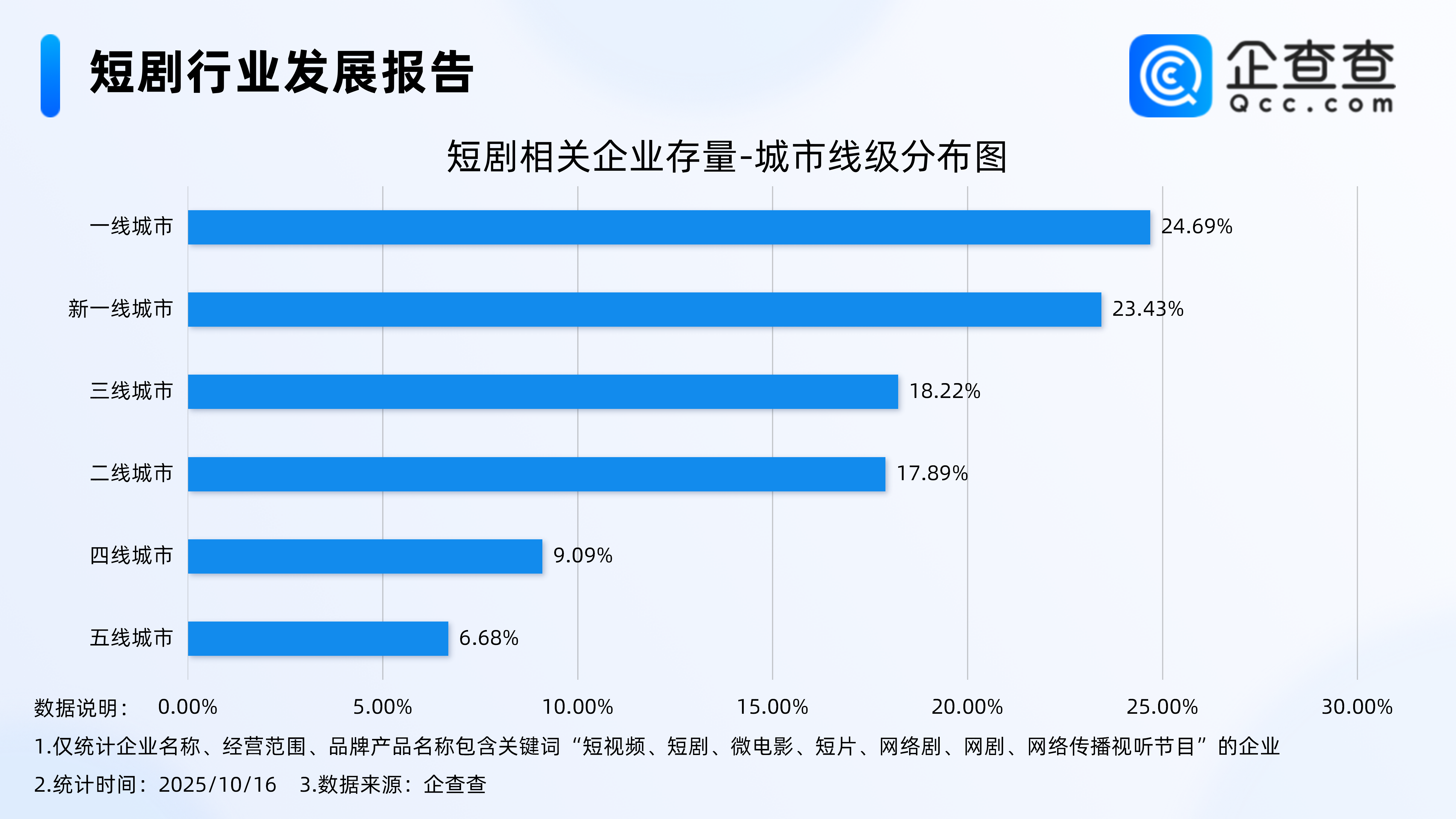 企查查数据显示,从城市线级分布来看,分布在一线城市的短剧相关企业最多,占比24.69%。其次,分布在新一线城市、三线城市的短剧相关企业分别占比23.43%、18.22%。
