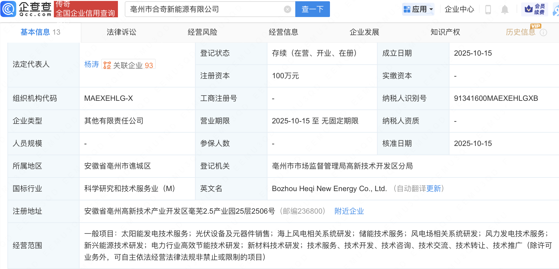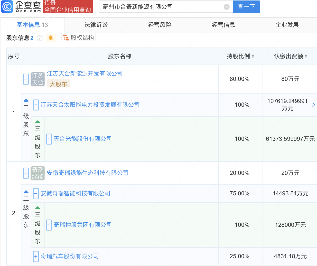 企查查APP显示,近日,亳州市合奇新能源有限公司成立,法定代表人为杨涛,经营范围包含:太阳能发电技术服务;光伏设备及元器件销售;海上风电相关系统研发;储能技术服务等。企查查股权穿透显示,该公司由天合光能(688599)旗下江苏天合新能源开发有限公司、奇瑞关联公司安徽奇瑞绿能生态科技有限公司共同持股。