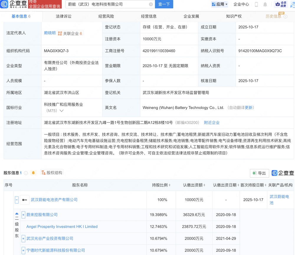 企查查APP显示,近日,蔚能(武汉)电池科技有限公司成立,法定代表人为赖晓明,注册资本1亿人民币,经营范围包括蓄电池租赁、新能源汽车废旧动力蓄电池回收及梯次利用、电动汽车充电基础设施运营等。企查查股权穿透显示,该公司由武汉蔚能电池资产有限公司全资持股,后者由蔚来控股有限公司、宁德时代(300750)等共同持股。