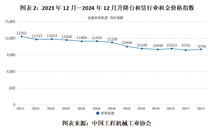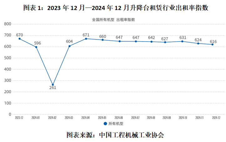 中国工程机械工业协会(下称“中机械”)于2024年1月24日发布的《2023年12月升降工作平台租赁景气度指数》显示,2023年3—11月,国内升降工作平台(下称“升降台”)所有机型出租率指数持续运行于700点上方,而《2024年12月升降工作平台租赁景气度指数》显示,自2023年12月以来,该指数整体呈下跌趋势,2024年12月已降至616点。