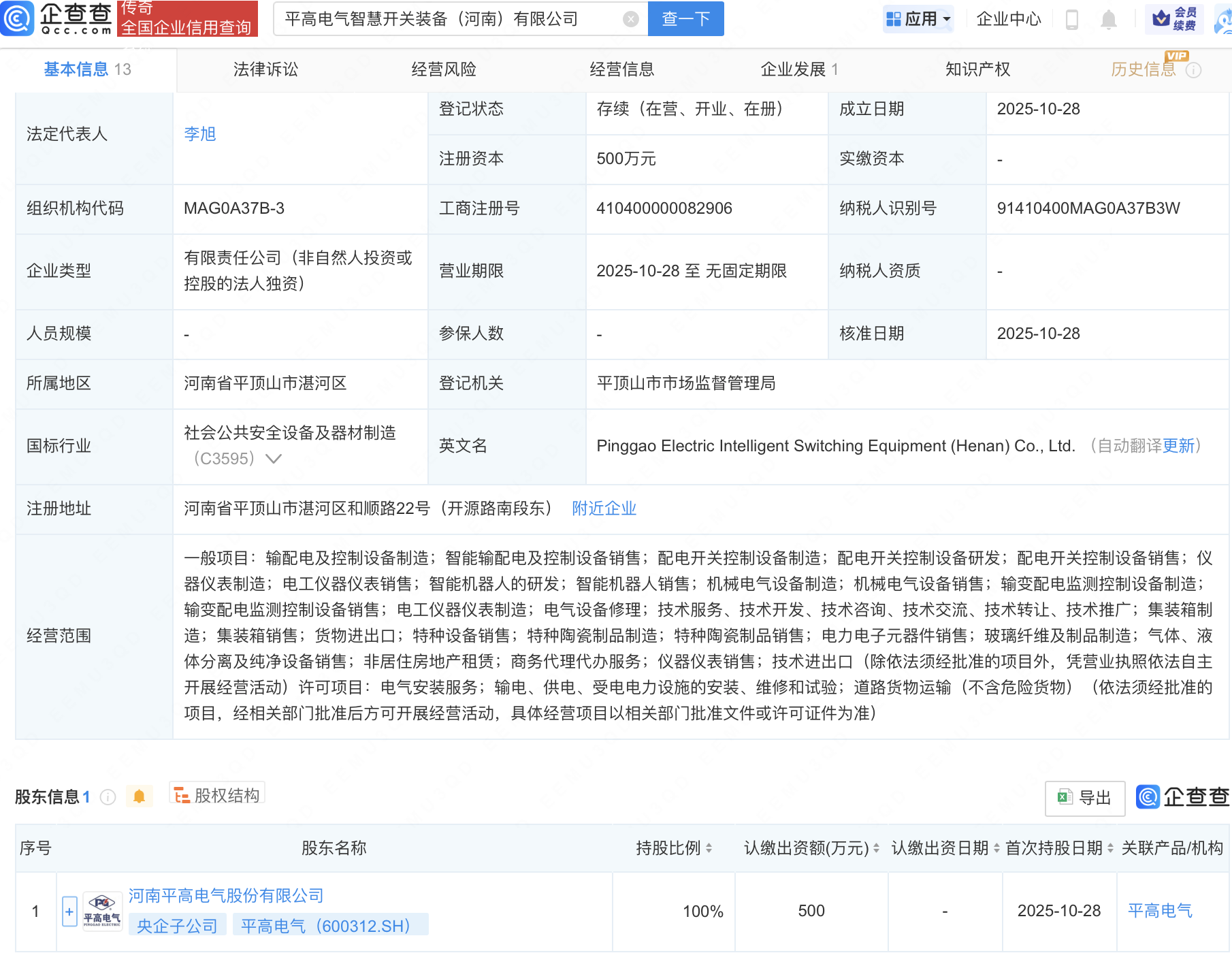 企查查APP显示,近日,平高电气智慧开关装备(河南)有限公司成立,法定代表人为李旭,经营范围包含:智能机器人的研发;智能机器人销售;机械电气设备制造;机械电气设备销售等。企查查股权穿透显示,该公司由平高电气(600312)全资持股。
