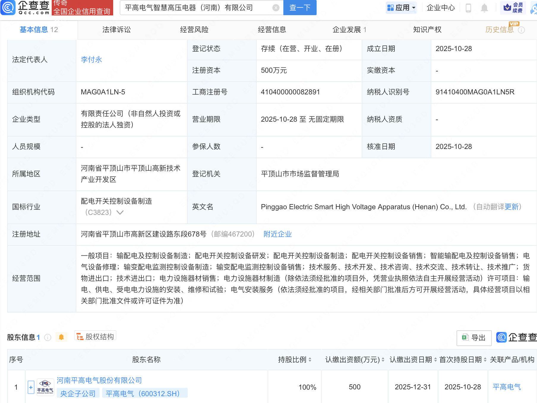 企查查APP显示,近日,平高电气智慧高压电器(河南)有限公司成立,经营范围包含:输配电及控制设备制造;配电开关控制设备研发;配电开关控制设备制造;配电开关控制设备销售等。企查查股权穿透显示,该公司由平高电气(600312)全资持股。