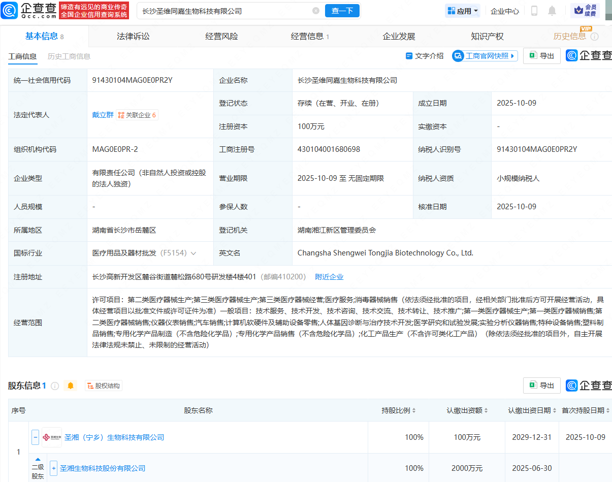 企查查APP显示,近日,长沙圣维同嘉生物科技有限公司成立,法定代表人为戴立群,经营范围包含:第二类医疗器械生产;第三类医疗器械生产;第二类医疗器械销售;人体基因诊断与治疗技术开发等。企查查股权穿透显示,该公司由圣湘生物(688289)间接全资持股。