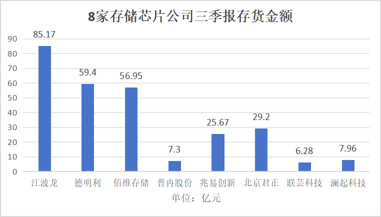 江波龙三季报显示,截至第三季度末,公司账上存货的金额为85.17亿元,高于其他存储芯片企业。