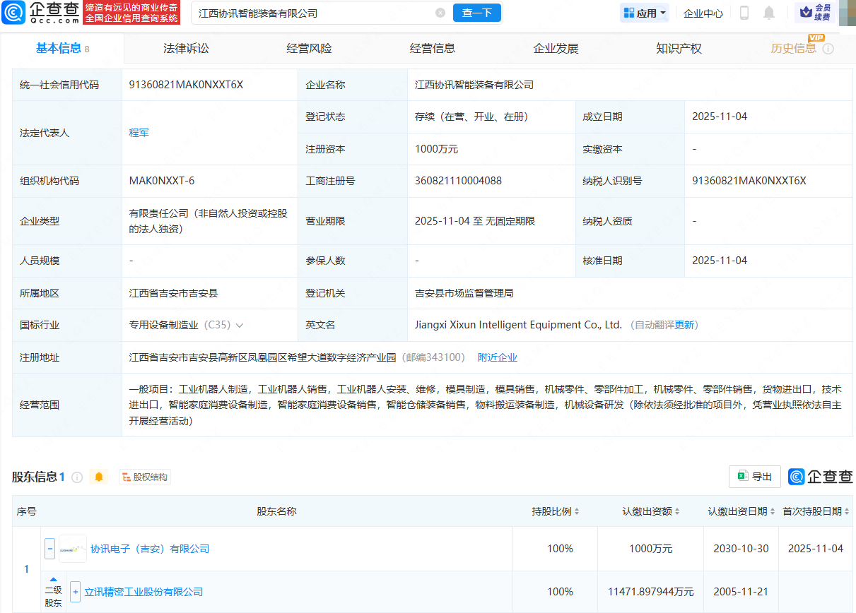 企查查APP显示,近日,江西协讯智能装备有限公司成立,法定代表人为程军,注册资本为1000万元,经营范围包含:工业机器人制造,工业机器人销售,模具制造,智能家庭消费设备制造,智能家庭消费设备销售等。企查查股权穿透显示,该公司由立讯精密(002475)旗下协讯电子(吉安)有限公司全资持股。