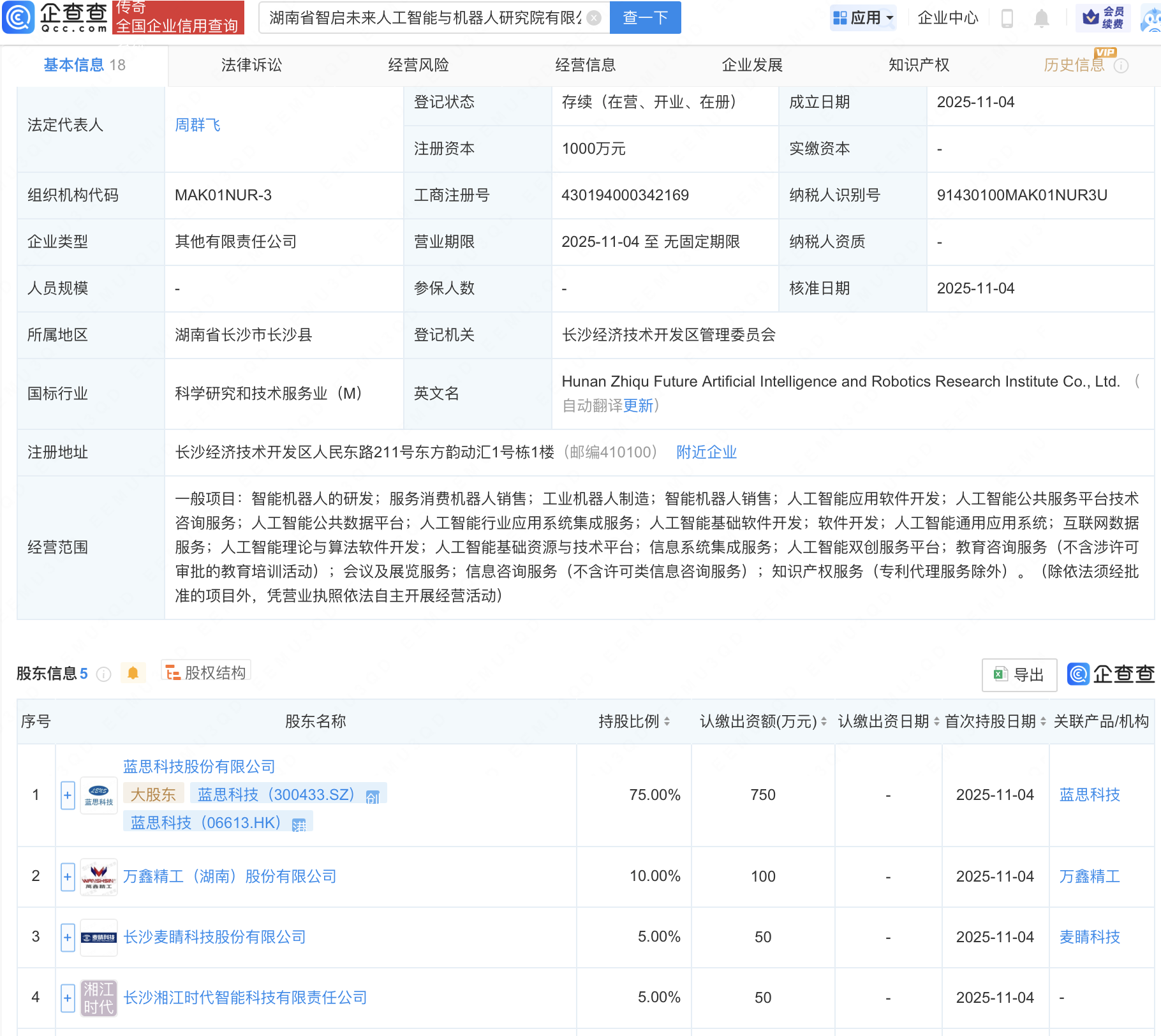 企查查APP显示,近日,湖南省智启未来人工智能与机器人研究院有限公司成立,注册资本1000万元,经营范围包含:智能机器人的研发;工业机器人制造;智能机器人销售;人工智能应用软件开发;人工智能公共服务平台技术咨询服务等。企查查股权穿透显示,该公司由蓝思科技(300433)等共同持股。