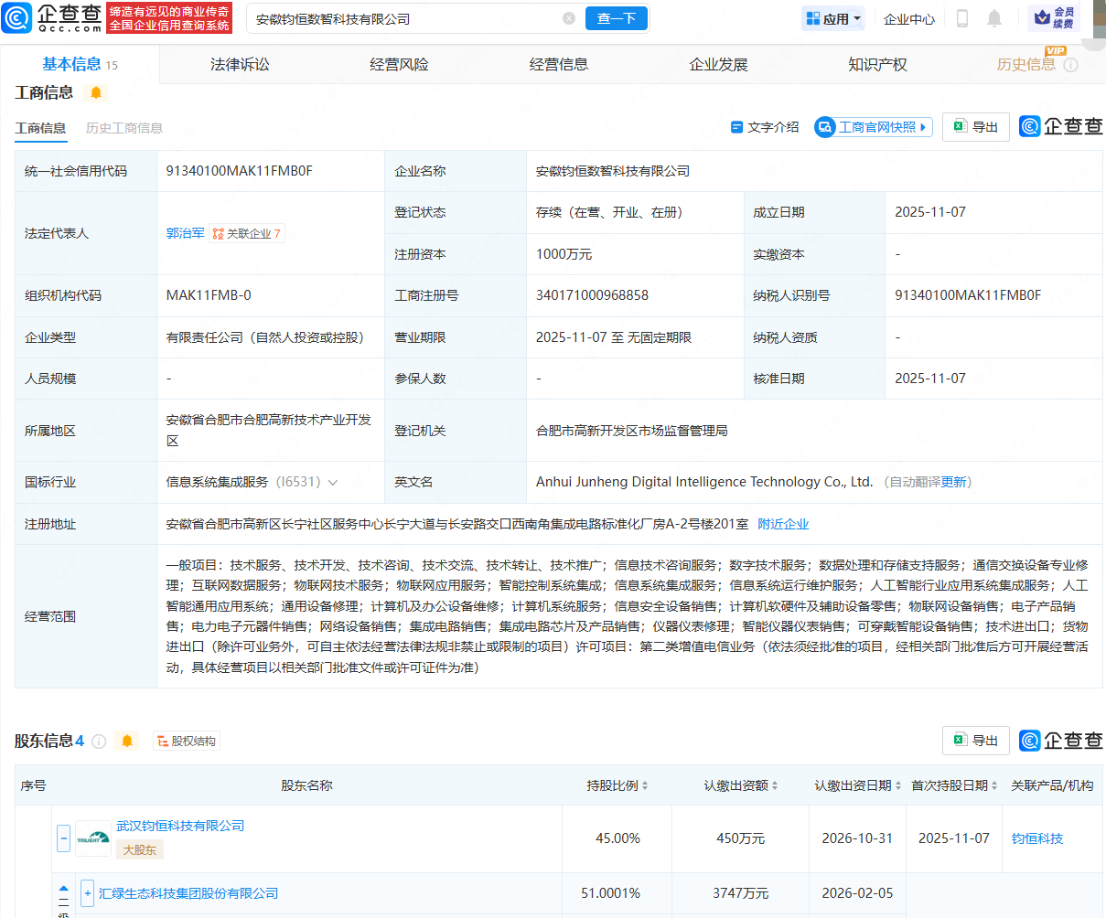 企查查APP显示,近日,安徽钧恒数智科技有限公司成立,法定代表人为郭治军,注册资本为1000万元,经营范围包含:数据处理和存储支持服务;物联网技术服务;人工智能通用应用系统;集成电路销售等。企查查股权穿透显示,该公司由汇绿生态(001267)旗下武汉钧恒科技有限公司等共同持股。
