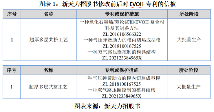 在招股书(上会稿)中,新天力已经将EVOH专利从批量生产的核心技术“超厚多层共挤工艺”的专利或保护措施中删除。