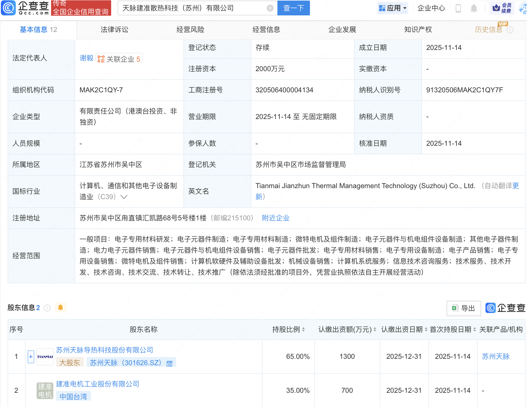 企查查APP显示,近日,天脉建准散热科技(苏州)有限公司成立,注册资本2000万元,经营范围包含:电子元器件制造;电子专用材料制造;微特电机及组件制造;电子元器件与机电组件设备制造等。企查查股权穿透显示,该公司由苏州天脉(301626)等共同持股。