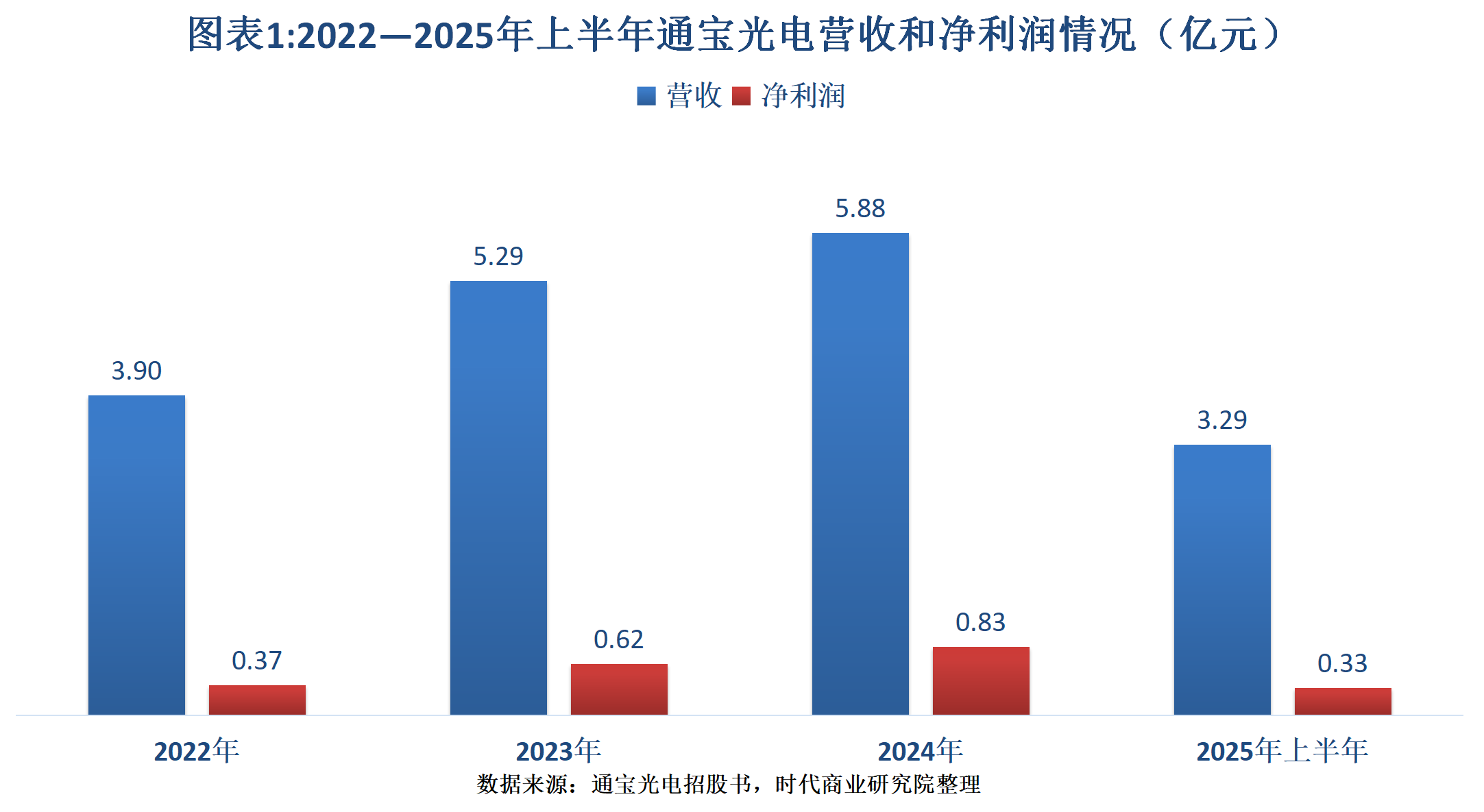 报告期各期,通宝光电的营收分别为3.90亿元、5.29亿元、5.88亿元、3.29亿元,净利润分别为0.37亿元、0.62亿元、0.83亿元、0.33亿元。根据通宝光电在新三板的公告和招股书披露的数据测算,同期其营收同比增速分别为56.87%、35.86%、11.02%、48.42%,净利润同比增速分别为300.03%、69.65%、33.49%、16.07%。