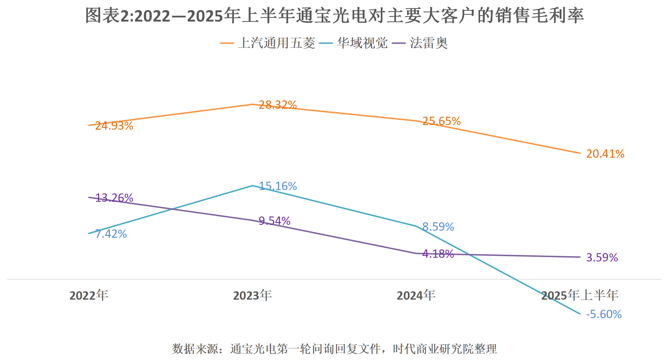 第一轮问询回复文件显示,今年上半年,通宝光电对上汽通用五菱汽车股份有限公司(下称“上汽通用五菱”)的销售毛利率为20.41%,跟2024年相比下降5.24个百分点;同期,对华域视觉科技(上海)有限公司(下称“华域视觉”)、法国法雷奥集团(下称“法雷奥”)的销售毛利率分别为-5.60%、3.59%,跟2024年相比分别下降14.19个百分点、0.59个百分点。