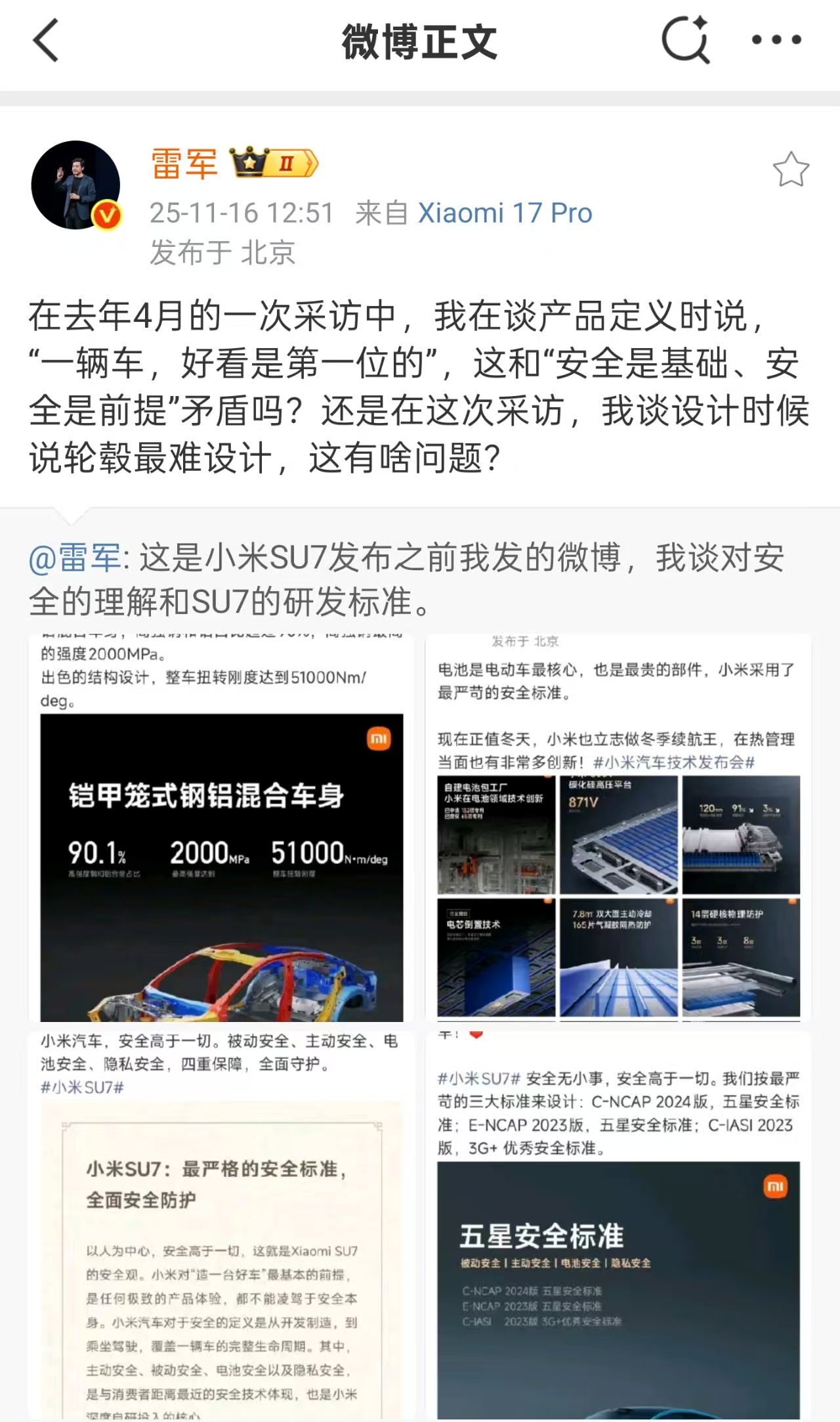同日,雷军还发布了他于2023年和2024年发布的四则微博截图,称“这是小米SU7发布之前我发的微博,我谈对安全的理解和SU7的研发标准。”