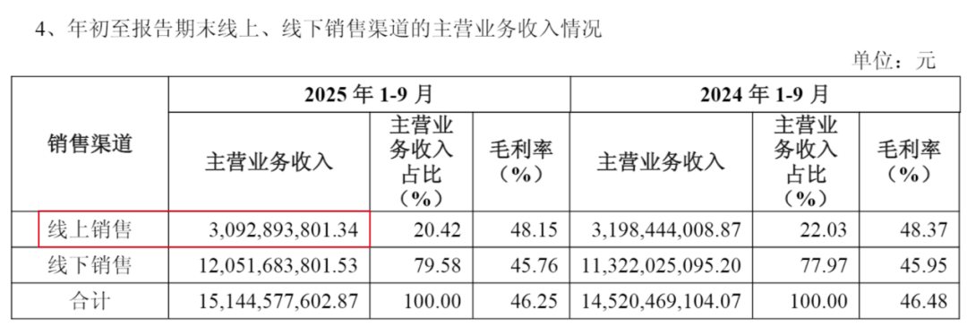 今年前三季度,公司线上销售实现营收为31亿元,同比下降3%,占总营业收入(156亿元)的比例不足20%。