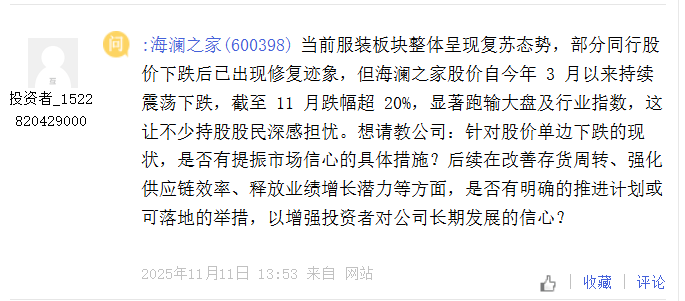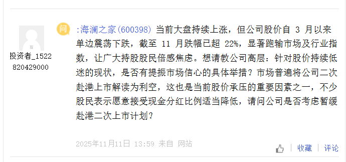 有投资者为此感到担忧,认为市场普遍将公司二次赴港上市解读为利空,这也是当前股价承压的重要因素之一,因而询问公司是否有暂缓赴港上市的计划?而海澜之家目前尚未对此予以回复。