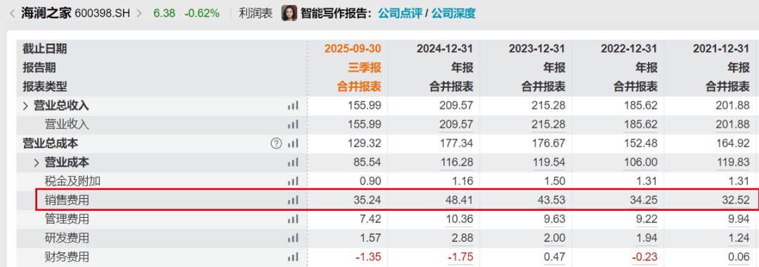 2021年至2025年前三季度,海澜之家的销售费用分别为32.52亿元、34.25亿元、43.53亿元、48.41亿元及35.24亿元。短短不到5年时间,公司的销售费用已经花了约194亿元。