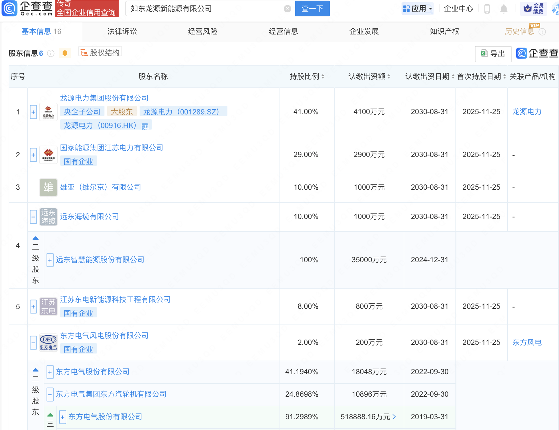 企查查APP显示,近日,如东龙源新能源有限公司成立,注册资本1亿元,经营范围包含:风力发电技术服务;太阳能发电技术服务;电气设备修理;海上风电相关系统研发;储能技术服务等。企查查股权穿透显示,该公司由龙源电力(001289)、国家能源集团江苏电力有限公司、远东股份(600869)全资子公司远东海缆有限公司、东方电气(600875)旗下东方电气风电股份有限公司等共同持股。