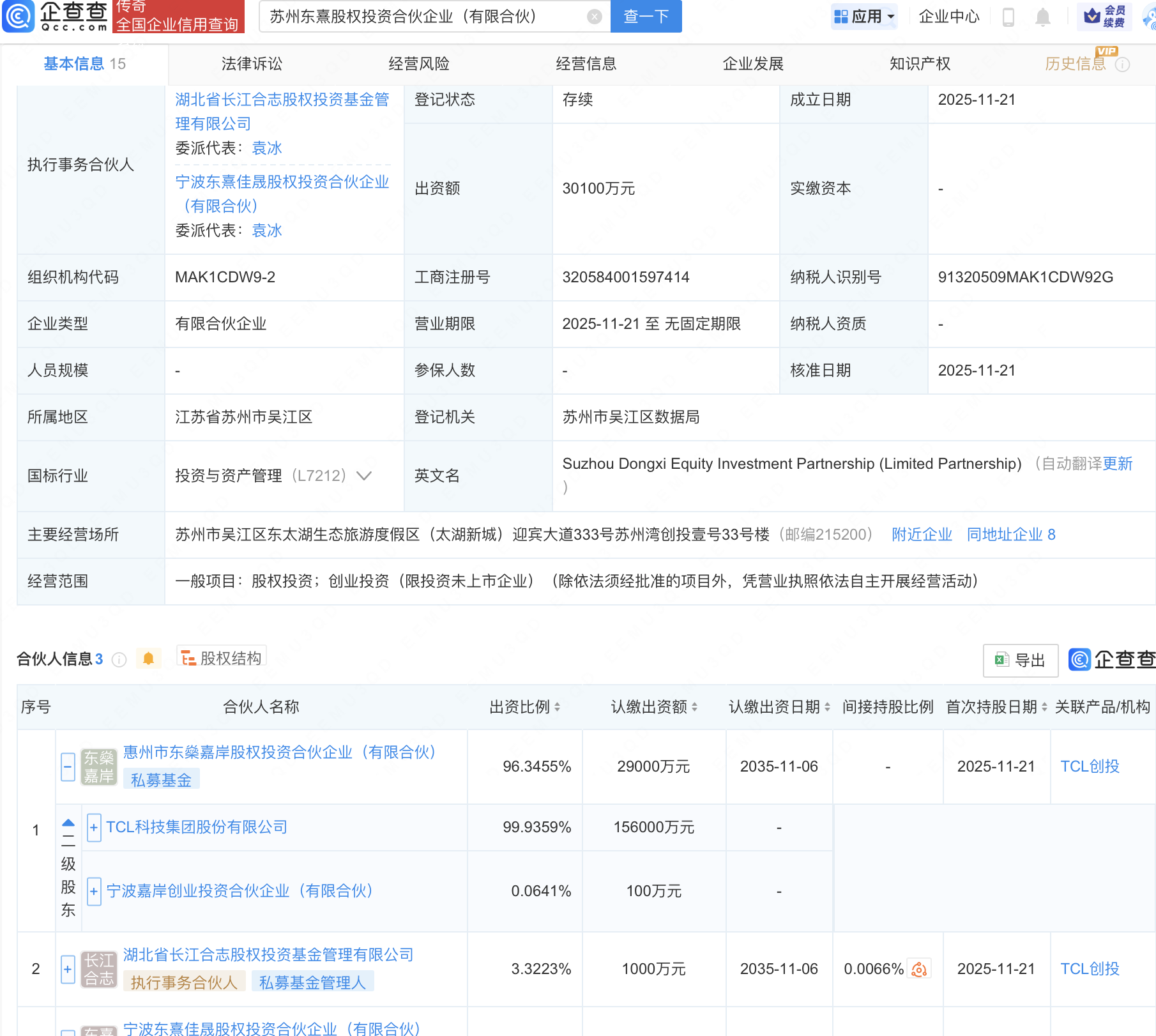 TCL科技等在苏州新设股权投资合伙企业