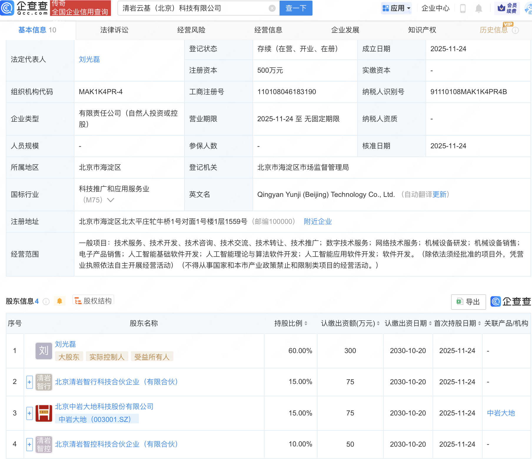 企查查APP显示,近日,清岩云基(北京)科技有限公司成立,经营范围包含:人工智能基础软件开发;人工智能理论与算法软件开发;人工智能应用软件开发等。企查查股权穿透显示,该公司由中岩大地(003001)等共同持股。