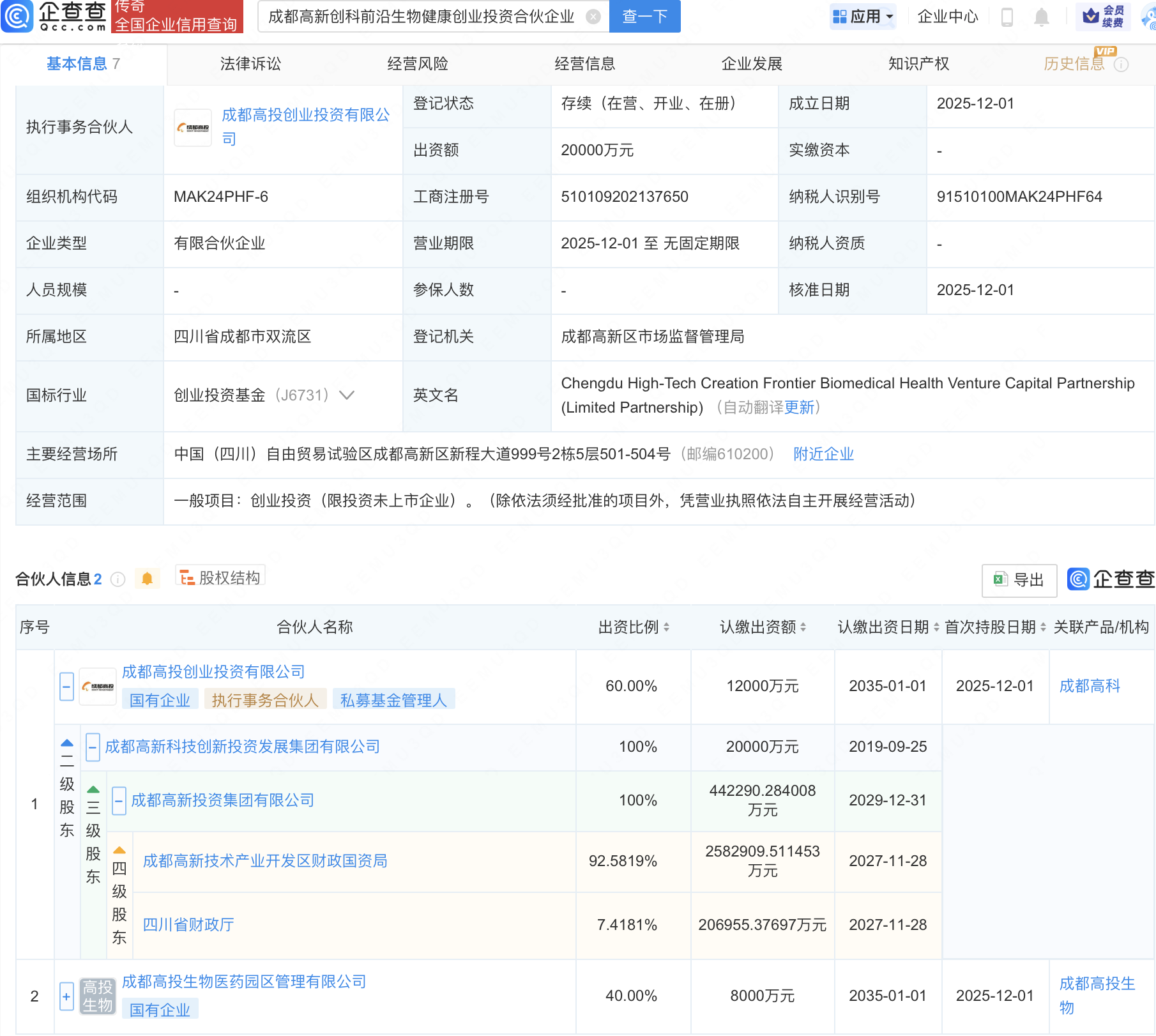 企查查APP显示,近日,成都高新创科前沿生物健康创业投资合伙企业(有限合伙)成立,出资额2亿元,经营范围包含:创业投资(限投资未上市企业)。企查查股权穿透显示,该企业由成都高投创业投资有限公司、成都高投生物医药园区管理有限公司共同出资。