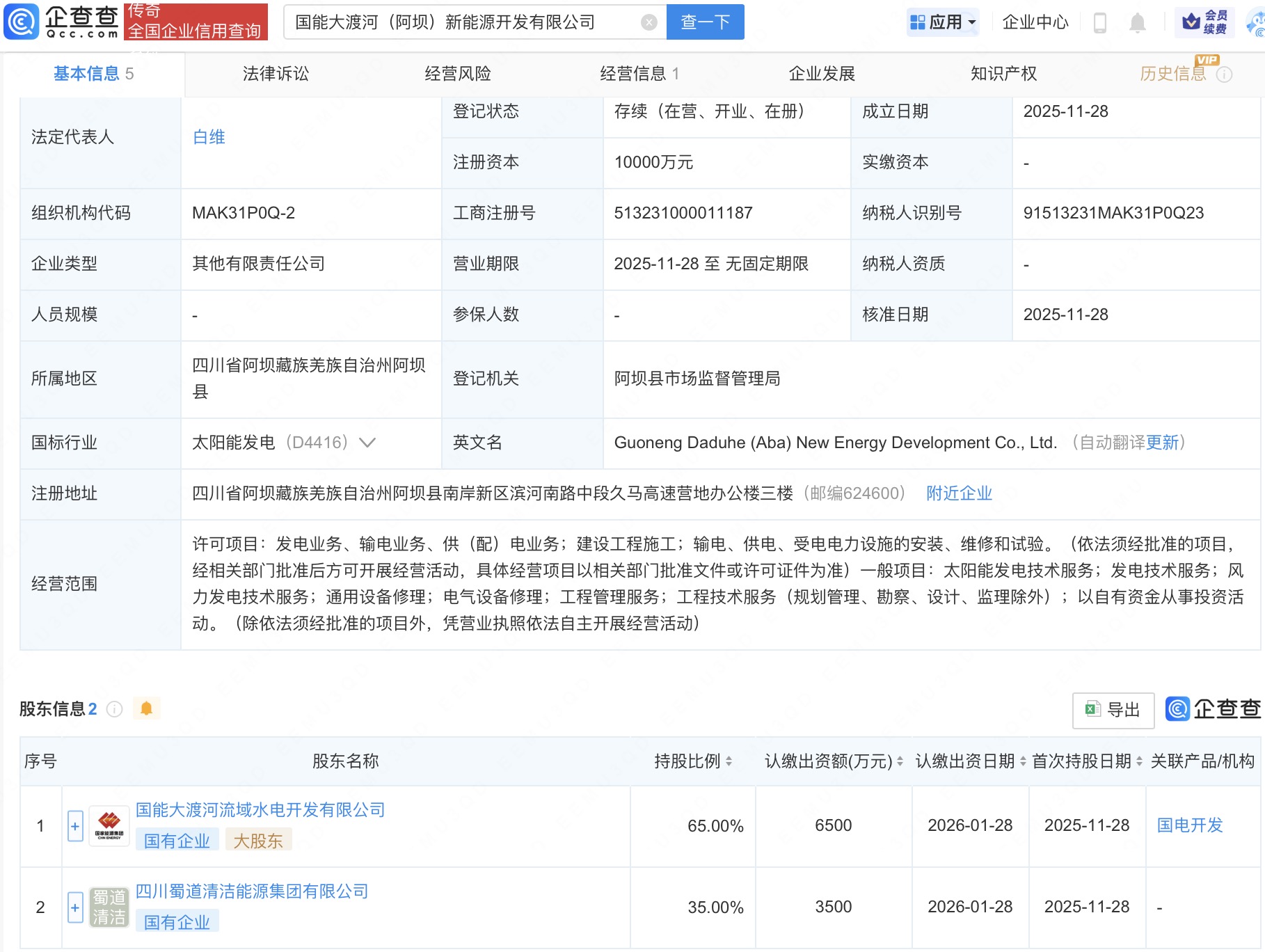 企查查APP显示,近日,国能大渡河(阿坝)新能源开发有限公司成立,法定代表人为白维,注册资本1亿人民币,经营范围包括太阳能发电技术服务、发电技术服务、风力发电技术服务等。企查查股权穿透显示,该公司由国能大渡河流域水电开发有限公司、四川蜀道清洁能源集团有限公司共同持股。