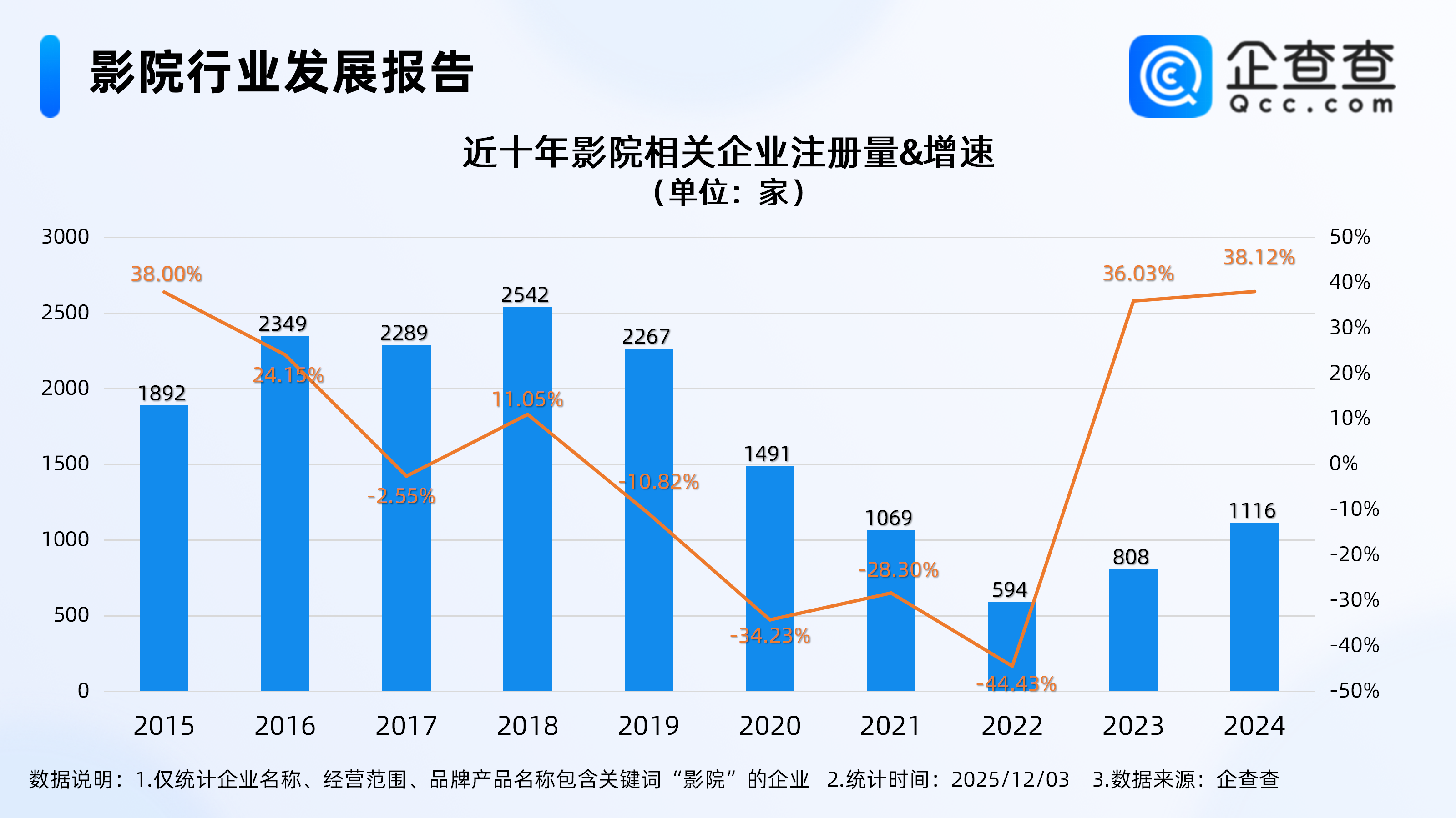 企查查数据显示,截至12月3日,国内现存影院相关企业1.52万家。注册量方面,2024年全年注册1116家影院相关企业,同比增长38.12%。截至目前,今年前11月已注册1134家相关企业,同比增长12.72%。