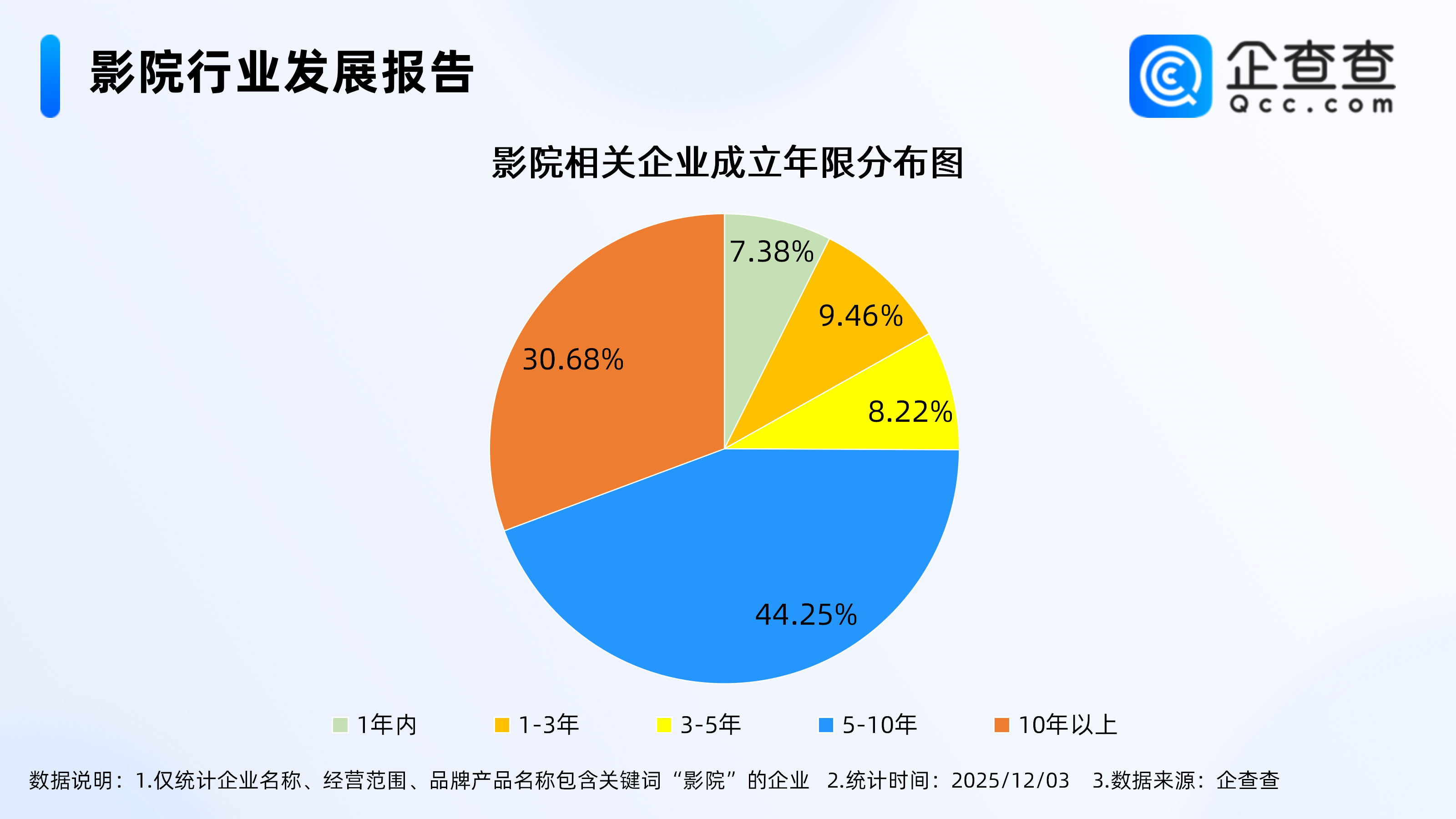 企查查数据显示,从经营时间来看,影院相关现存企业多为老牌企业,成立年限在5-10年的相关企业最多,占比44.25%。其次,成立年限在10年以上的相关企业占比30.68%。